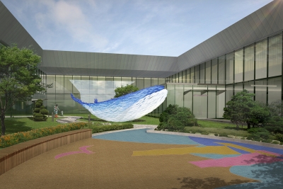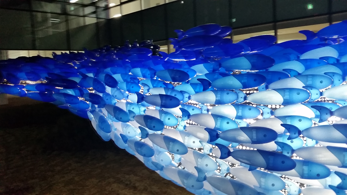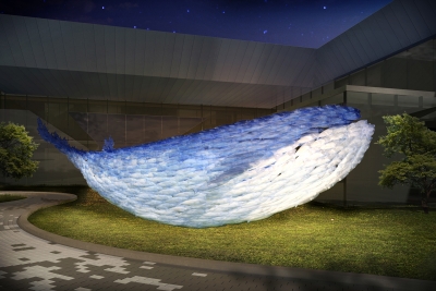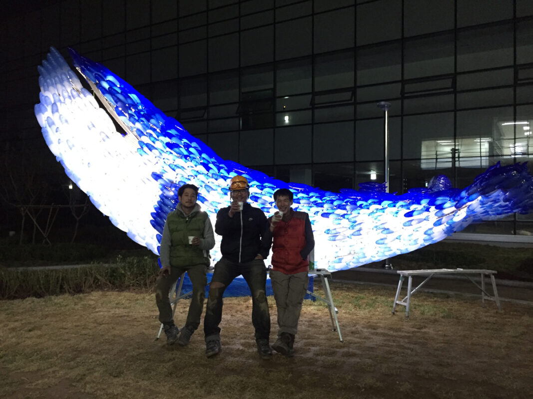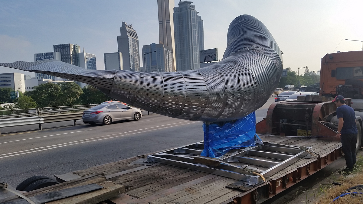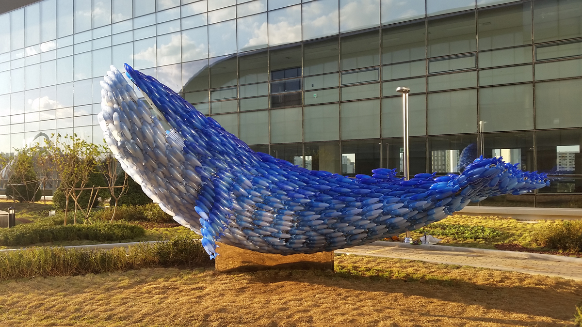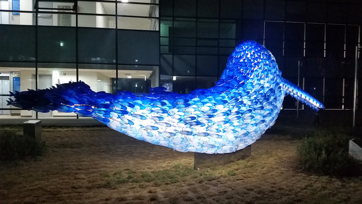 “Full of Blue Light” is a symbolic sculpture of the vibrant Noryangjin Fish Market, where over 2,000 employees and merchants work around the clock to distribute seafood from all over the country. Installed on the rooftop of the newly constructed market building in 2015, this public sculpture consists of numerous small fish shapes that together form the outline of a giant whale. Each small blue fish represents the blue-collar workers, the market traders who illuminate the market, while the white fish symbolize the white-collar workers, the market operators. This whale symbolizes the fish market, composed of both groups working in harmony. Additionally, the sculpture was created to mitigate conflicts and promote unity between market operators and merchants during the relocation to the new Noryangjin market building. The blue color of the fish represents the cleanliness and freshness of all seafood distributed here, as well as the honest labor and sweat of the workers. The light emitted from the sculpture, through light-diffusing pigments and materials, expresses the vibrant energy of the fish market, which operates 24/7, 365 days a year.