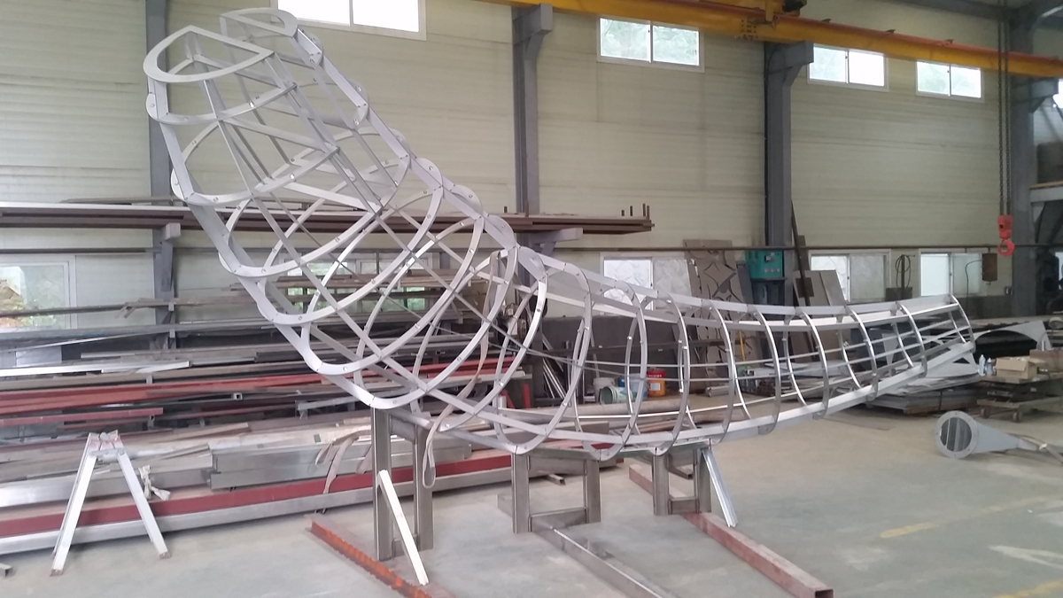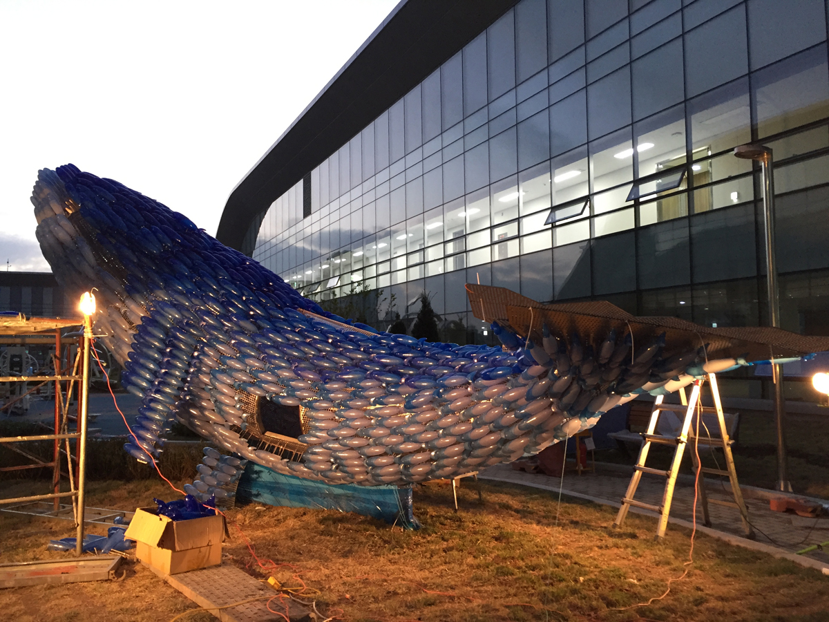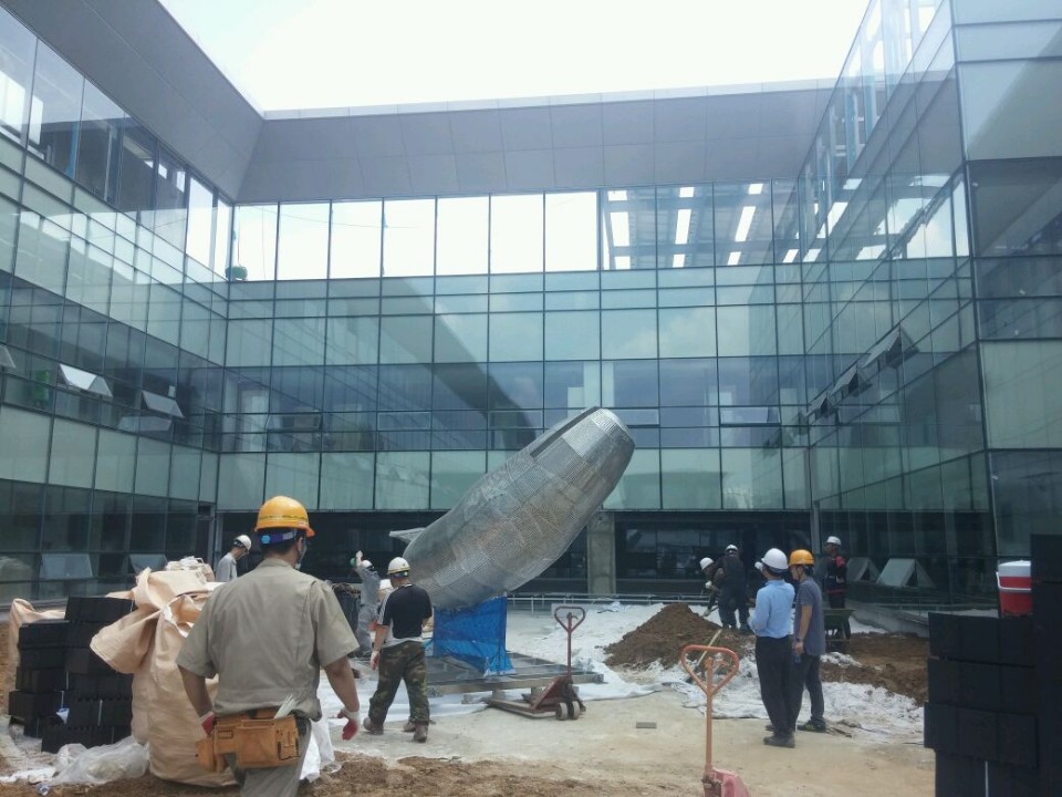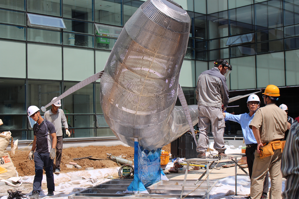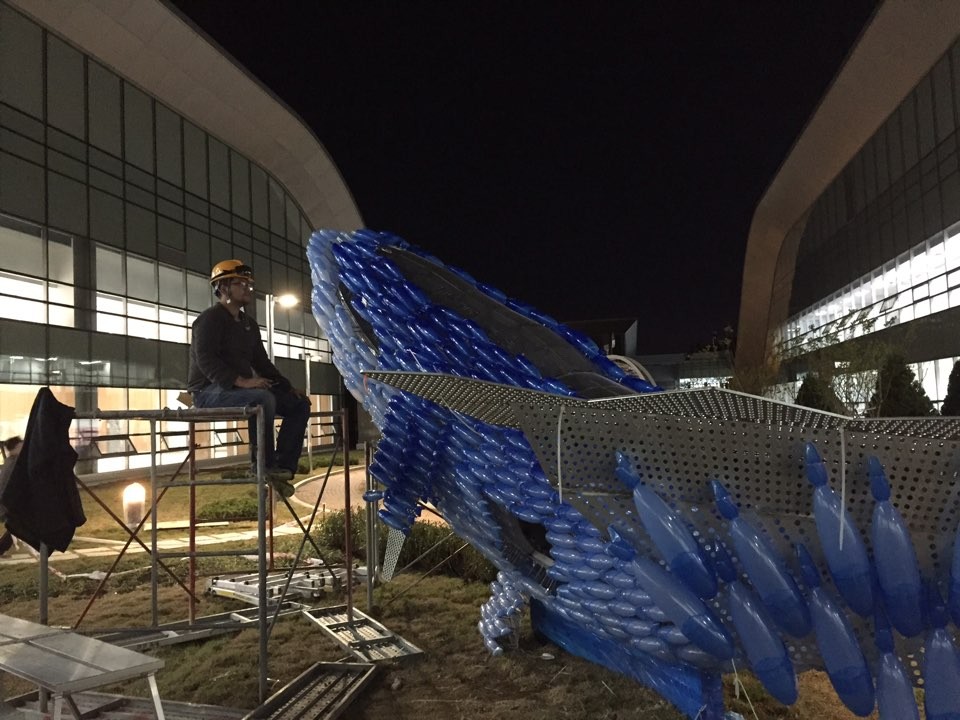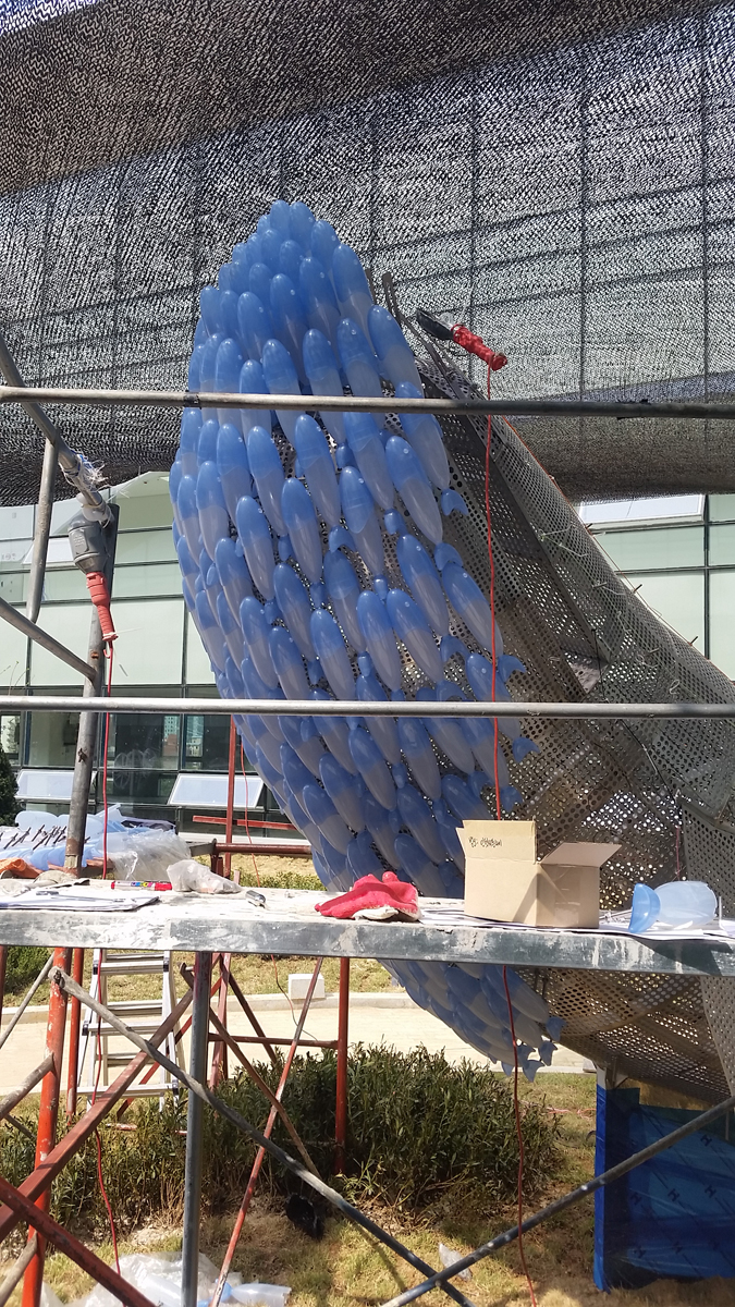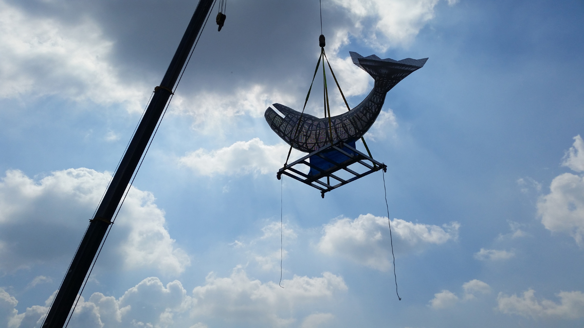 Due to changes in the construction schedule of the new building, I had to install the frame of the whale first before attaching the fish to it. The frame was intended to be placed in the center of the rooftop garden. The weight of the whale-shaped frame was 1.2 tons, requiring the use of a 100-ton crane to lift it to a considerable height in the narrow space. Since this operation was conducted before planting grass in the rooftop garden, my team and I had to contend with blowing sand and dust throughout the installation process.