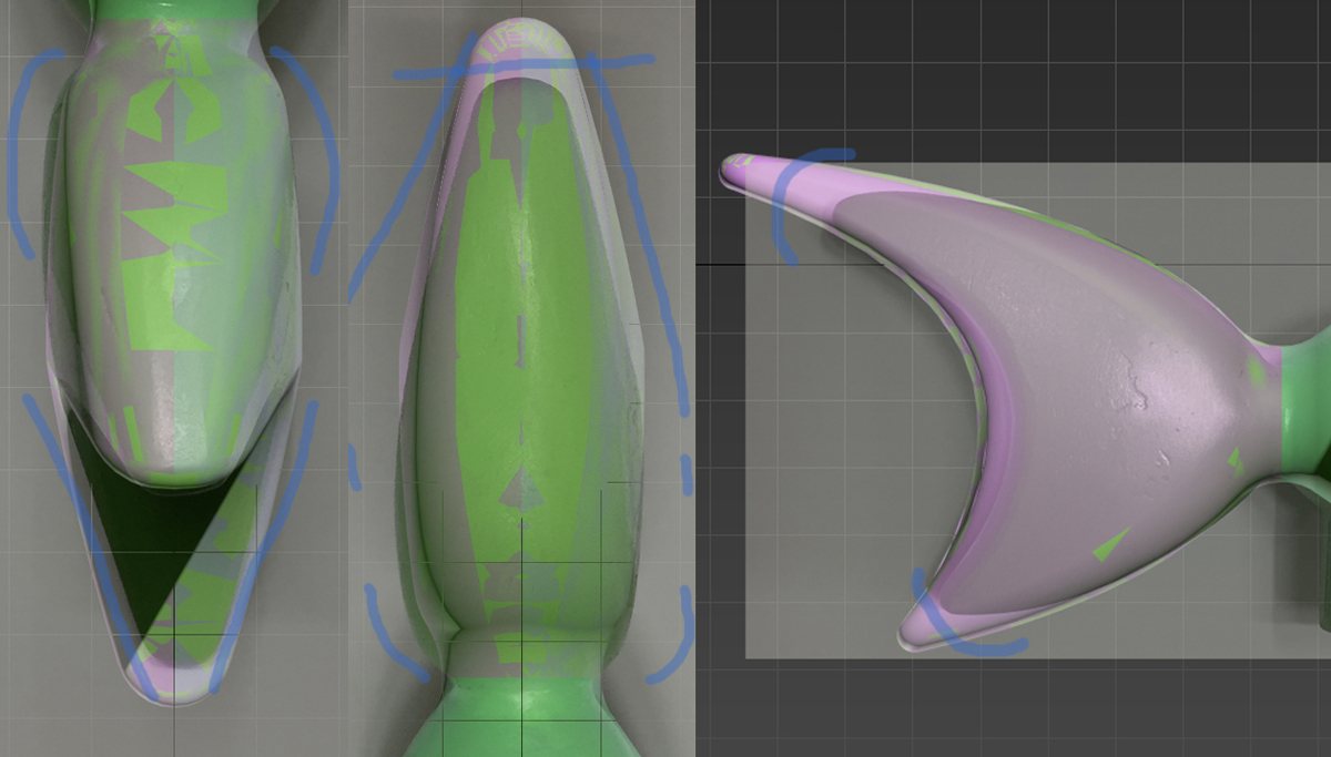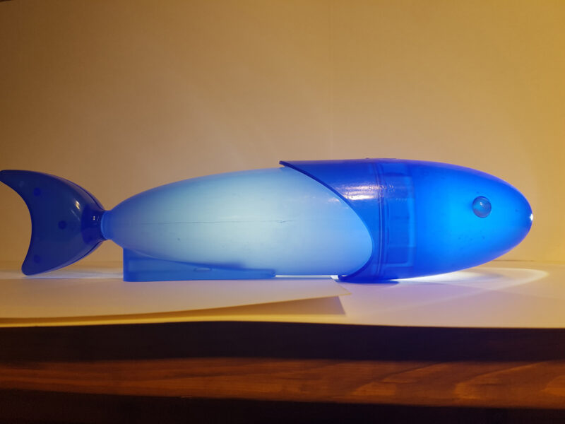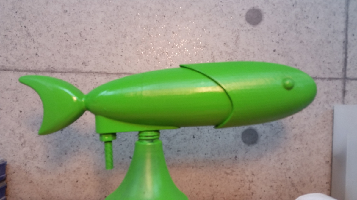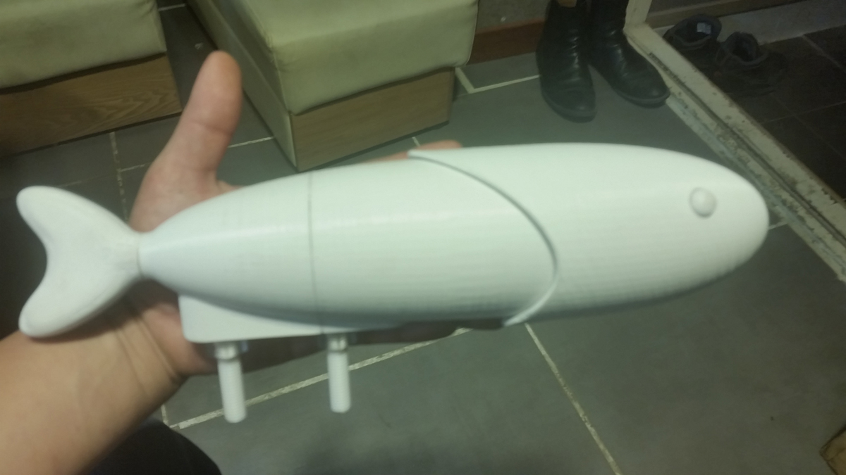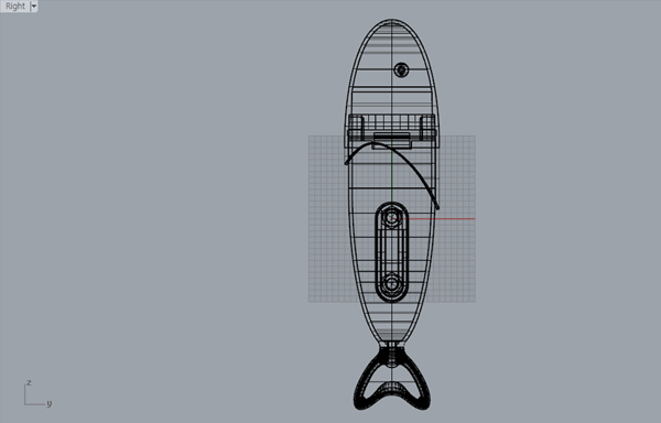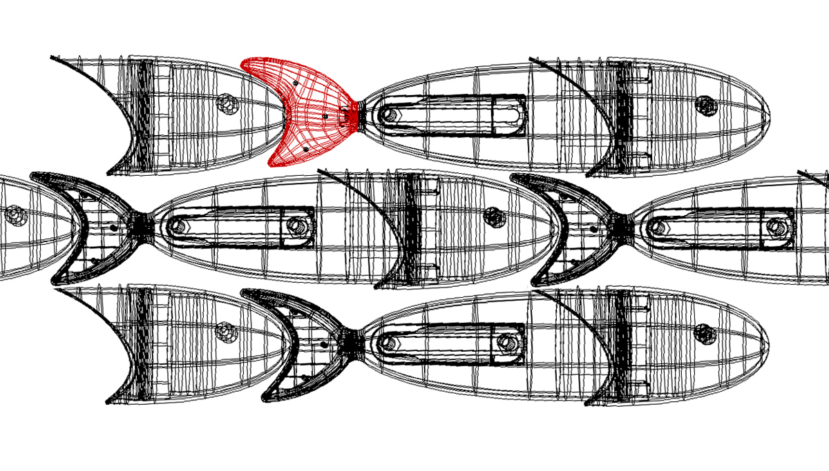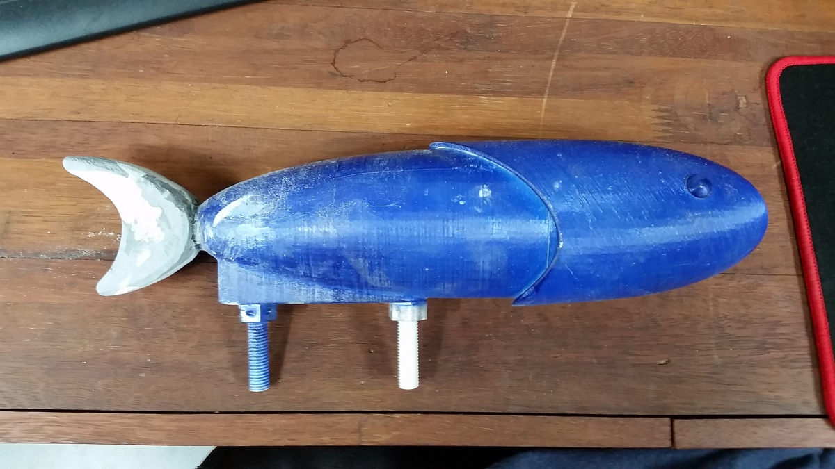 The prototype fish was 3D printed after converting the MAX file to CAD format. Numerous iterations were made thereafter, involving adjustments with epoxy putty, scanning the model with a 3D scanner, and editing it using Rhino software.
