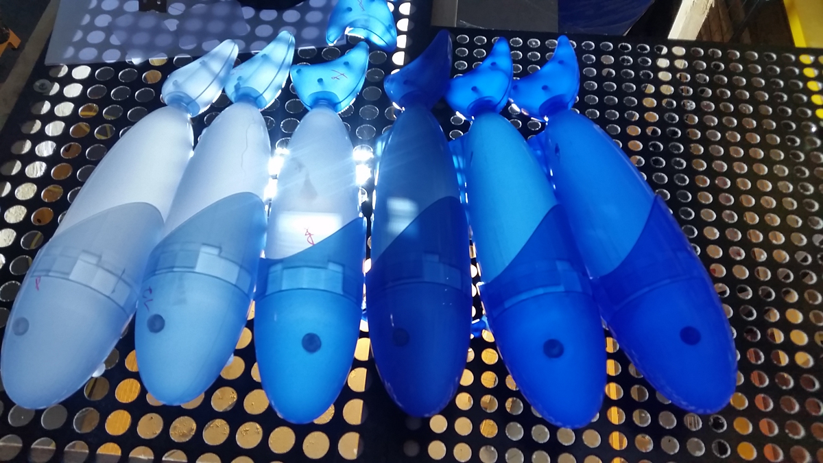 I rented an injection molding machine and mixed pigments with polycarbonate and UV blockers to directly cast the fish pieces.