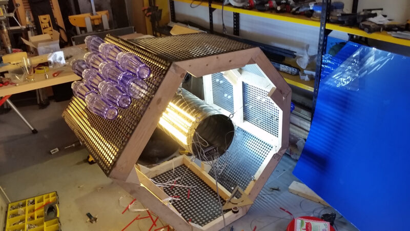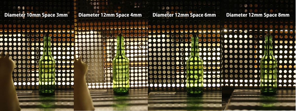 I conducted multiple tests to ensure that the connection points between the fish pieces and bolts and nuts on the whale-shaped frame could withstand a weight of 110kg while maintaining the lightest possible weight. I tested the strength and light transmission of stainless steel sheets ranging from 0.5mm to 3mm in six different thicknesses and with four different hole diameters for the frame material. Since the final casting of the fish had not yet occurred, I used blue plastic cups made from a similar polycarbonate material. The frame was modeled in CAD and laid out flat on blueprints used to determine hole placement.