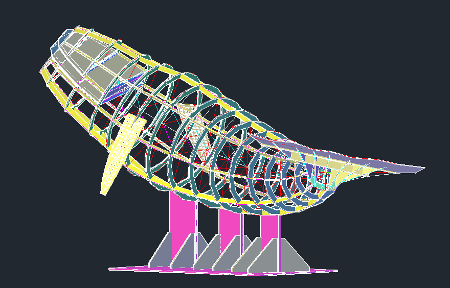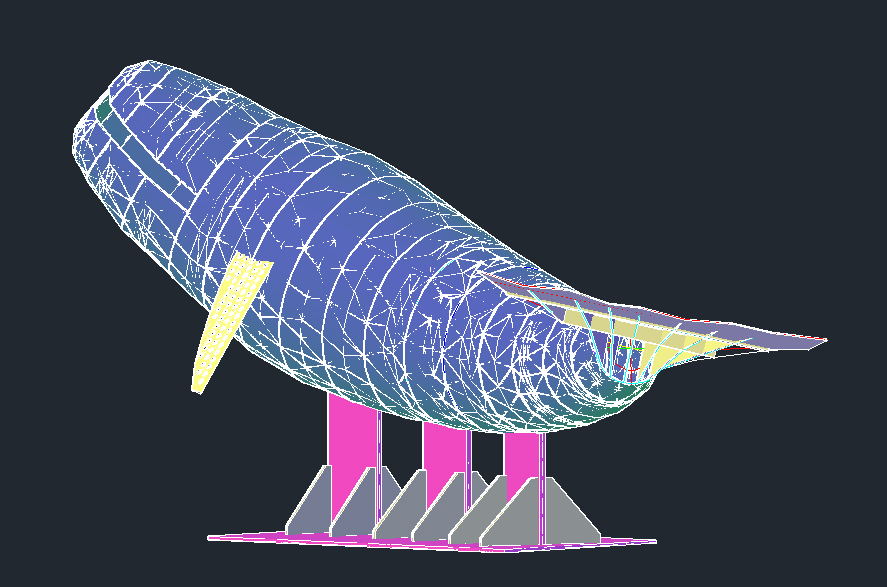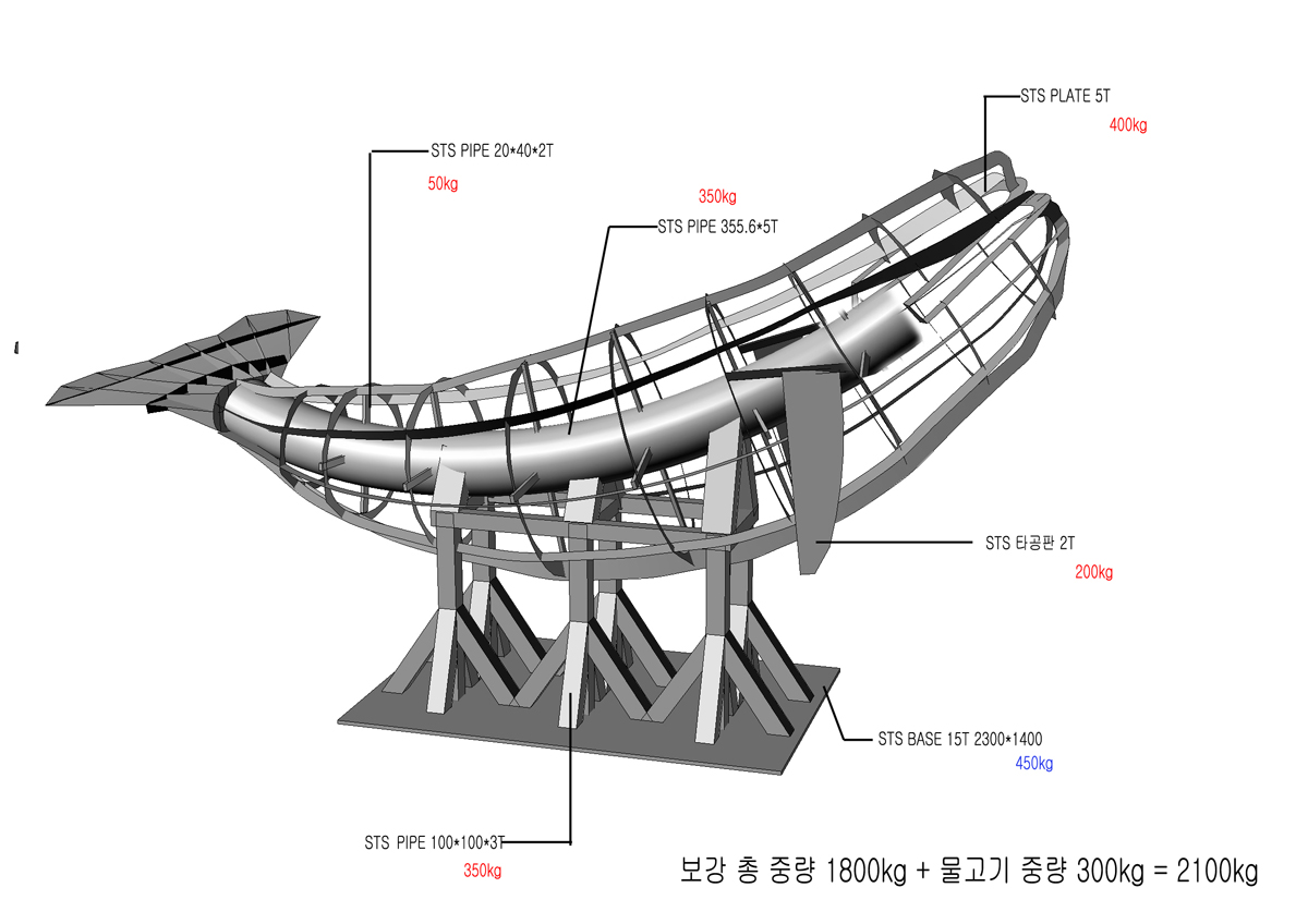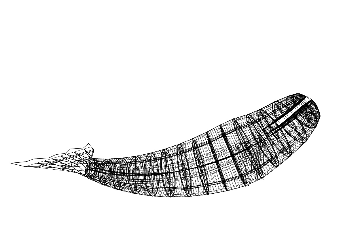 Determining the drilling positions was one of the most challenging stages in this project. Each hole had to be meticulously placed to determine the position of each fish, ensuring they wouldn’t collide while still allowing the entire whale frame to be wrapped in a zigzag pattern. Additionally, because the whale frame was curved to one side, calculations had to be done separately for each row of holes. I devised a formula to calculate the position of each hole row for the previous and next rows, considering the proportional area covered by the fish over the entire surface area of the frame. To develop this formula, I sought advice from Mr. Lee Dong-geon, who was not only the developer of South Korea’s first fighter jet but also my high school math teacher. Comparing the drilling blueprint with the 3D model, minor adjustments were necessary.