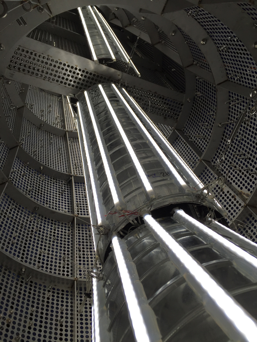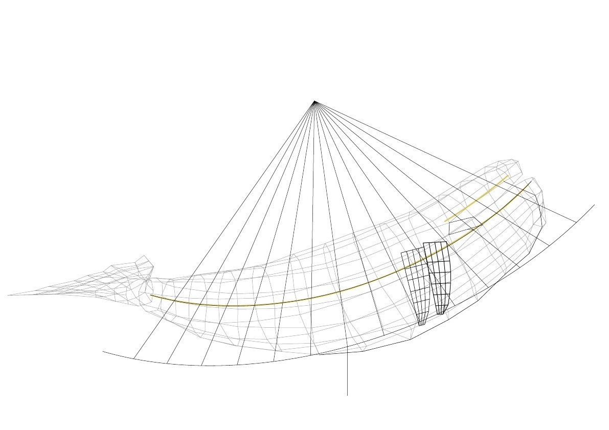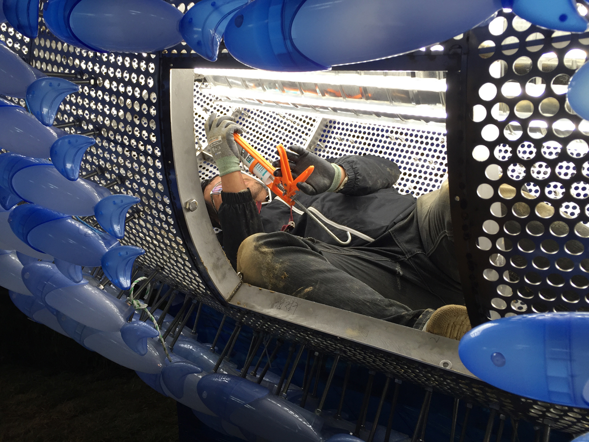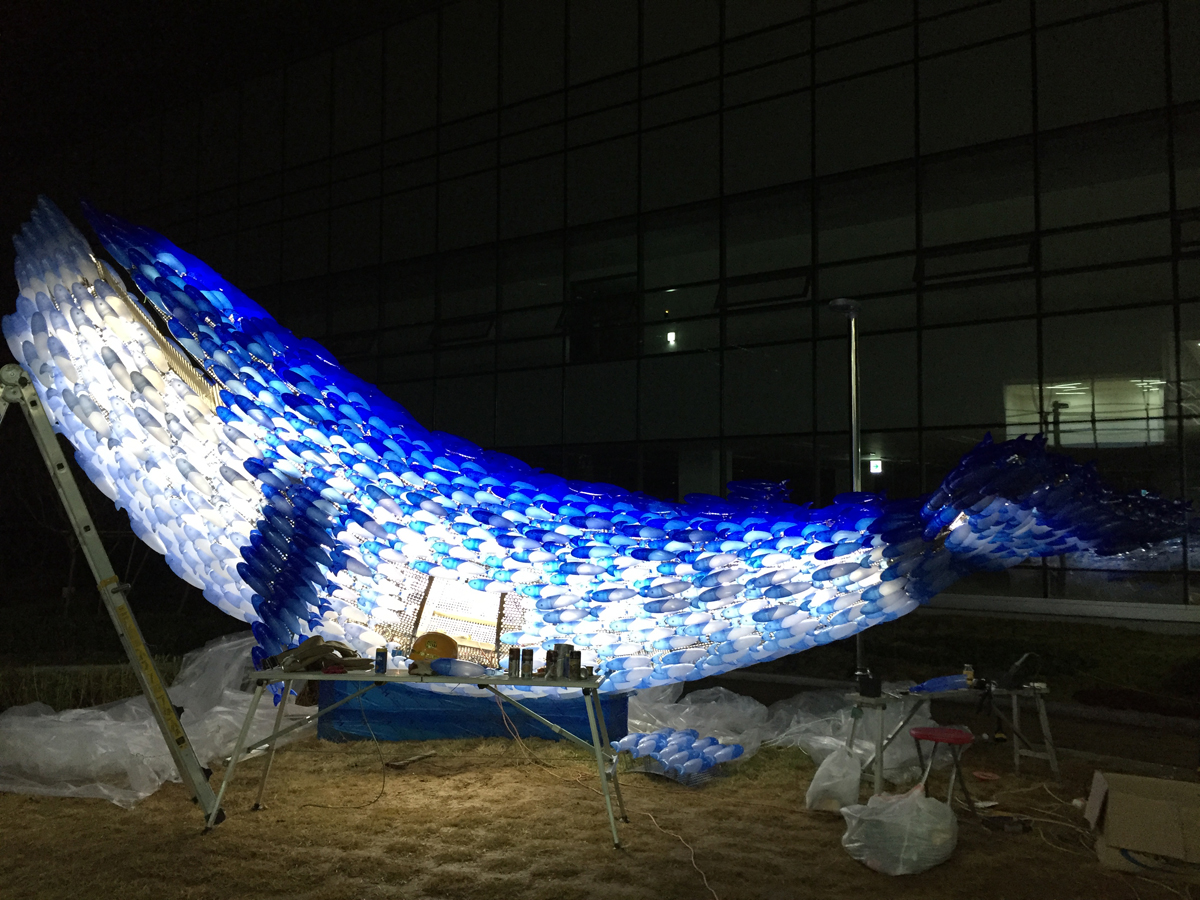 After sunset, I projected images of a 3D model that delineated the boundaries of fish groups with different colors using a beam projector. To mark the outline on the whale-shaped pieces, I tied strings to the frame. Subsequently, I began attaching polycarbonate fish one by one. To perform this task, one worker had to secure nuts inside the metal frame of the whale, while another worker tightened bolts from the outside into the fish. I repeated this process several times, adjusting bolt lengths to achieve the desired design.