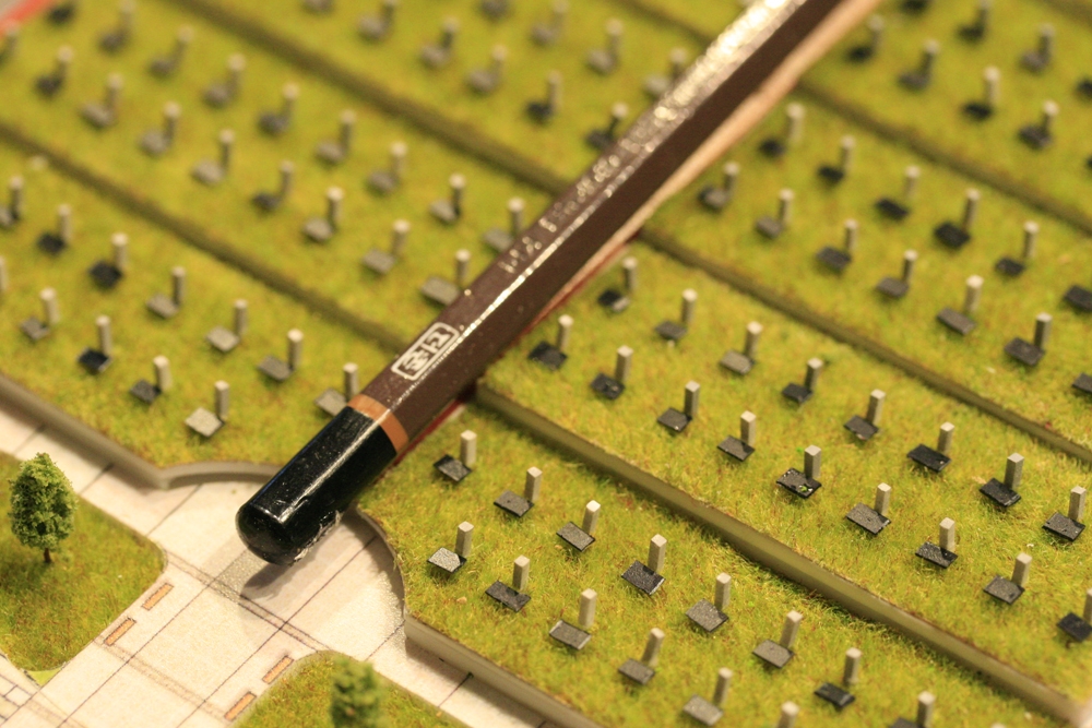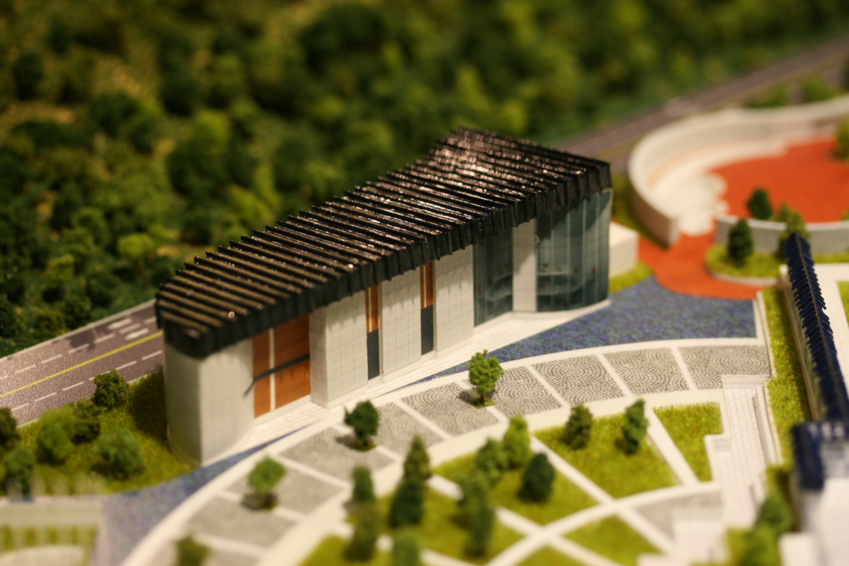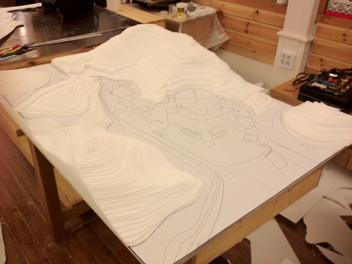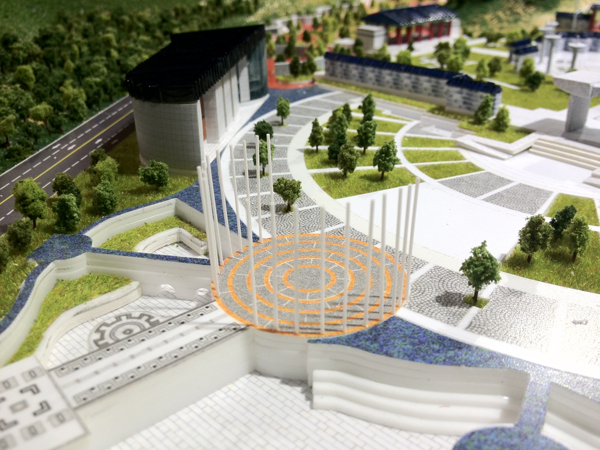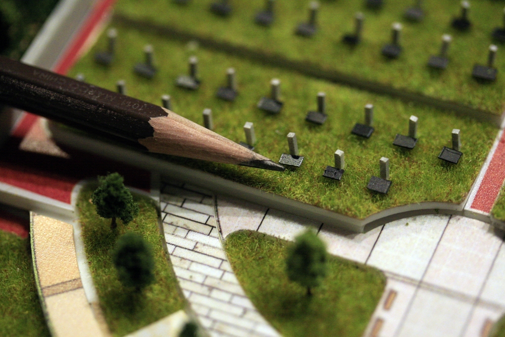 Miniature Model Drawing: Reduced building scales to 500:1 and terrain scales to 600:1 to create detailed miniature drawings.