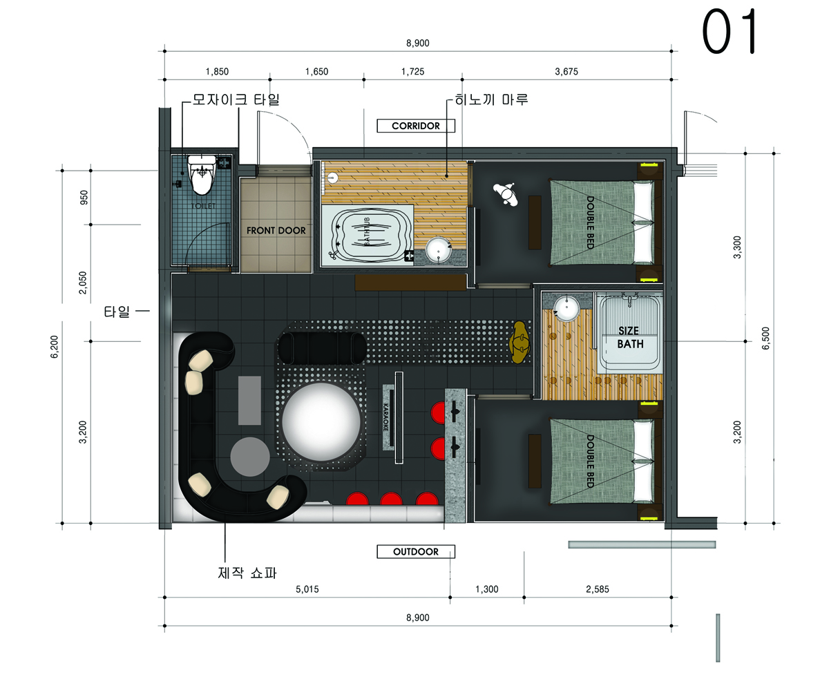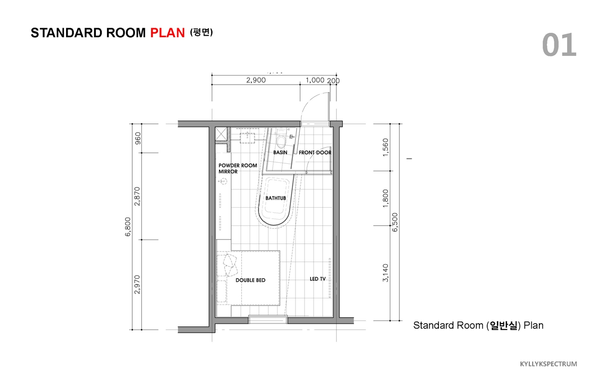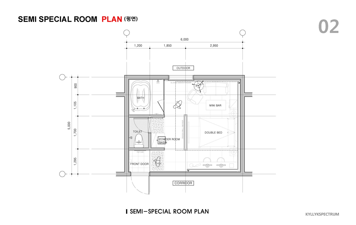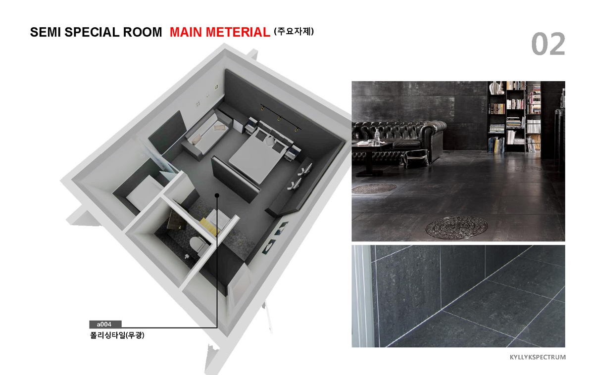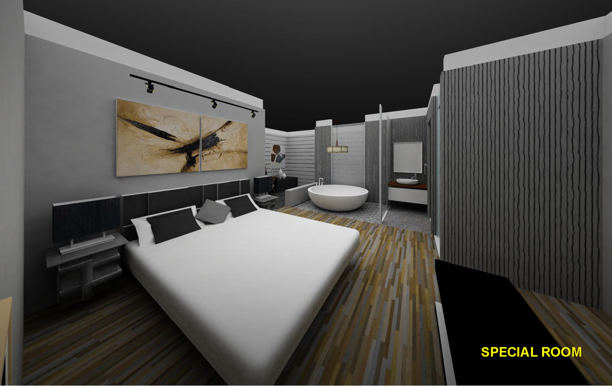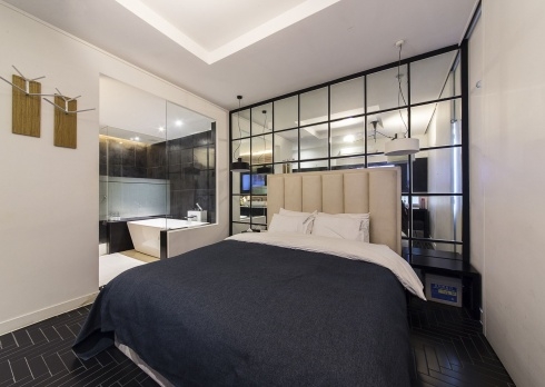 C Suite Room has a brilliant and broad effect by placing a mirror on one wall. I reduced the size of the bathtub and enlarged the space, unlike other Suite Rooms, to minimize the movement of the bath and area with the bed.