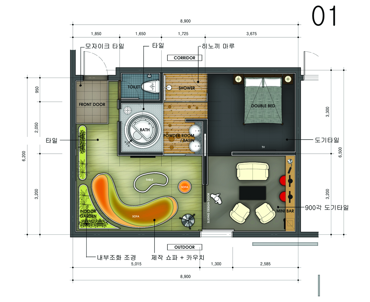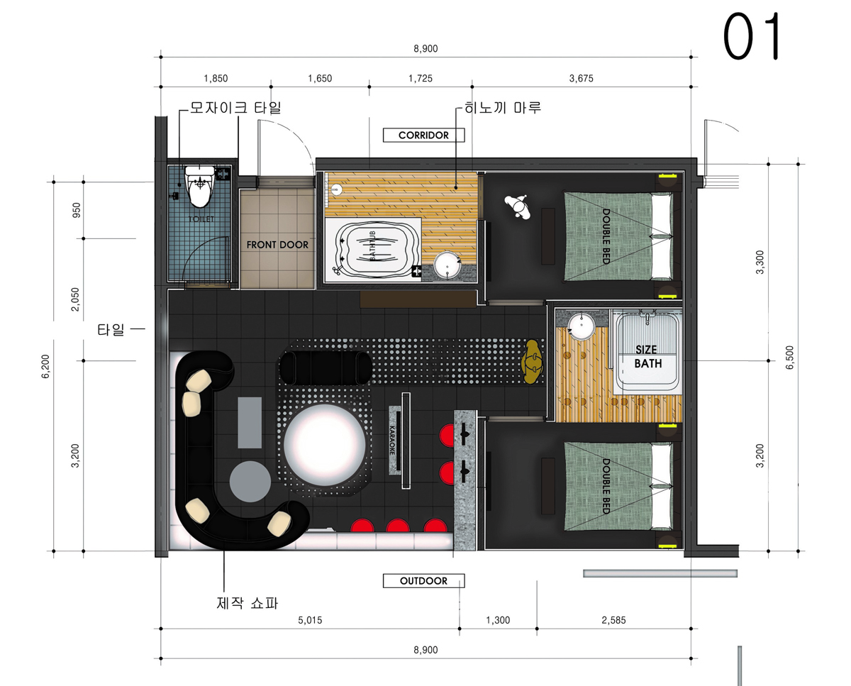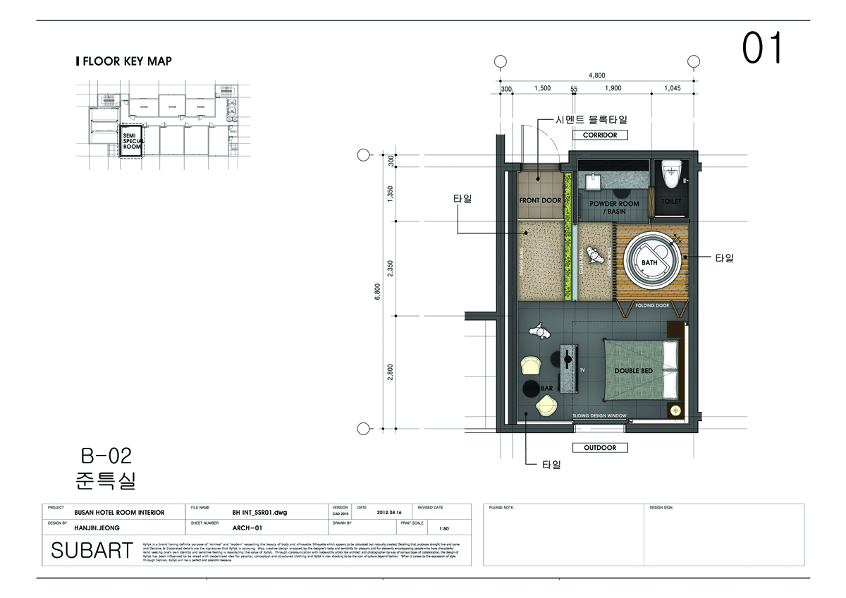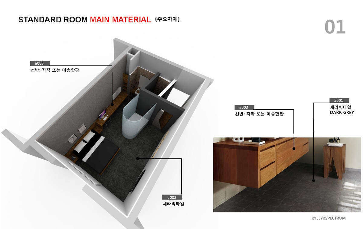 C Suite Room has a brilliant and broad effect by placing a mirror on one wall. I reduced the size of the bathtub and enlarged the space, unlike other Suite Rooms, to minimize the movement of the bath and area with the bed.