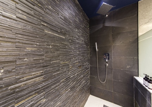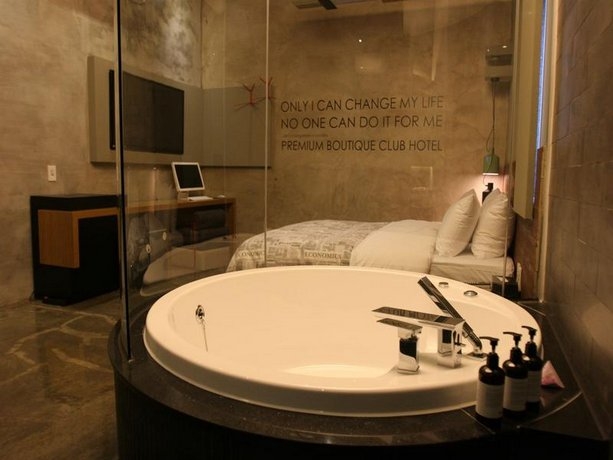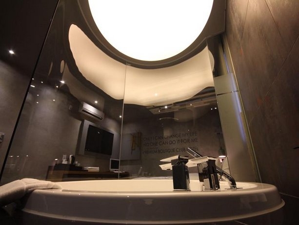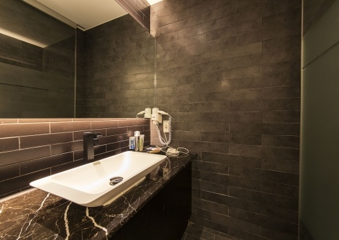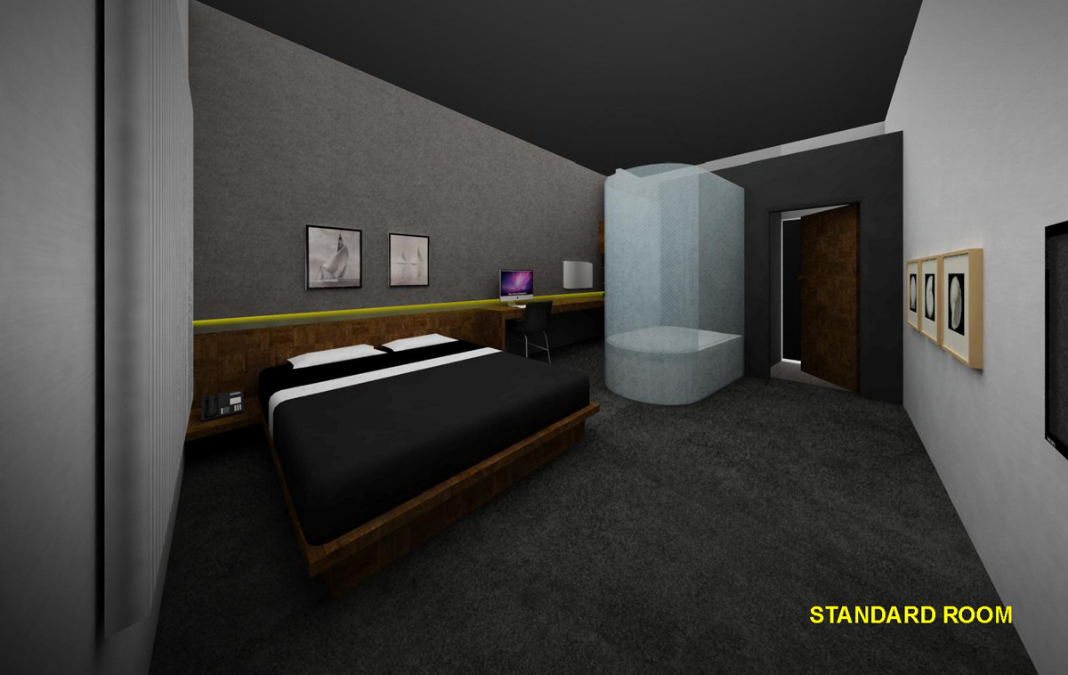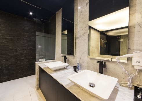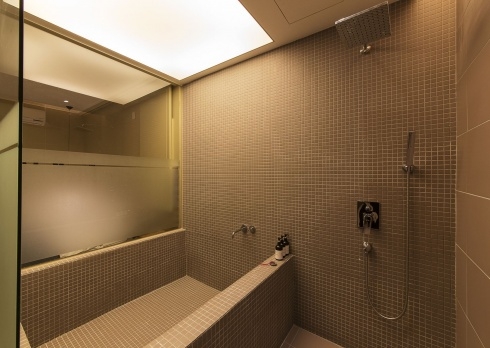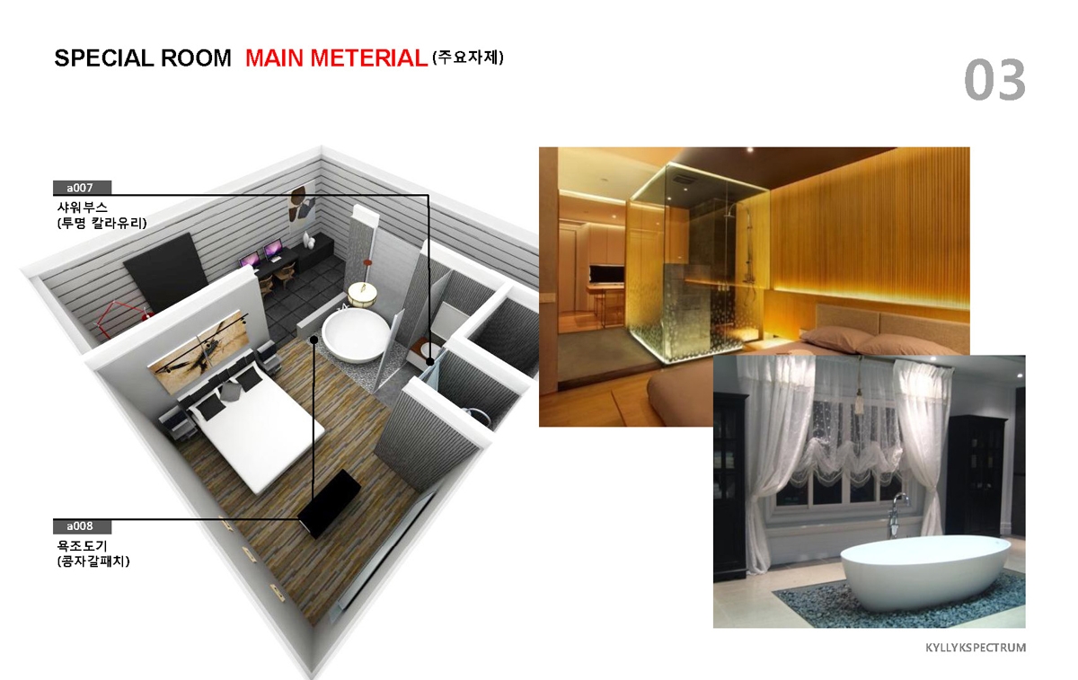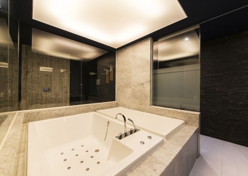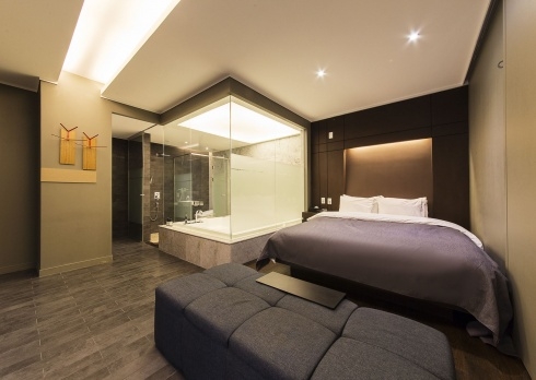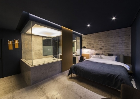 The bathroom in the standard room used curved glass. The ceiling-mounted lighting was installed on the bath. It made this room special. To give the visitor a romantic atmosphere, I spotted their movement and illuminated the lights behind their backs.