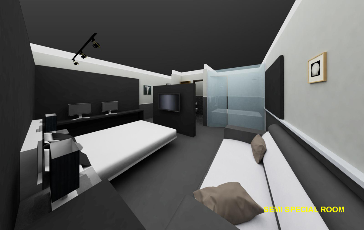 The semi-special room used warmer colors and brighter lighting to create a family-friendly atmosphere. Glass partitions were used to divide the space, making the room feel larger. The spacious bathroom, with tiled surfaces, was designed for shared enjoyment. Wooden furniture and ivory walls enhanced the warm, inviting mood.
