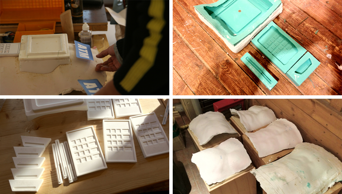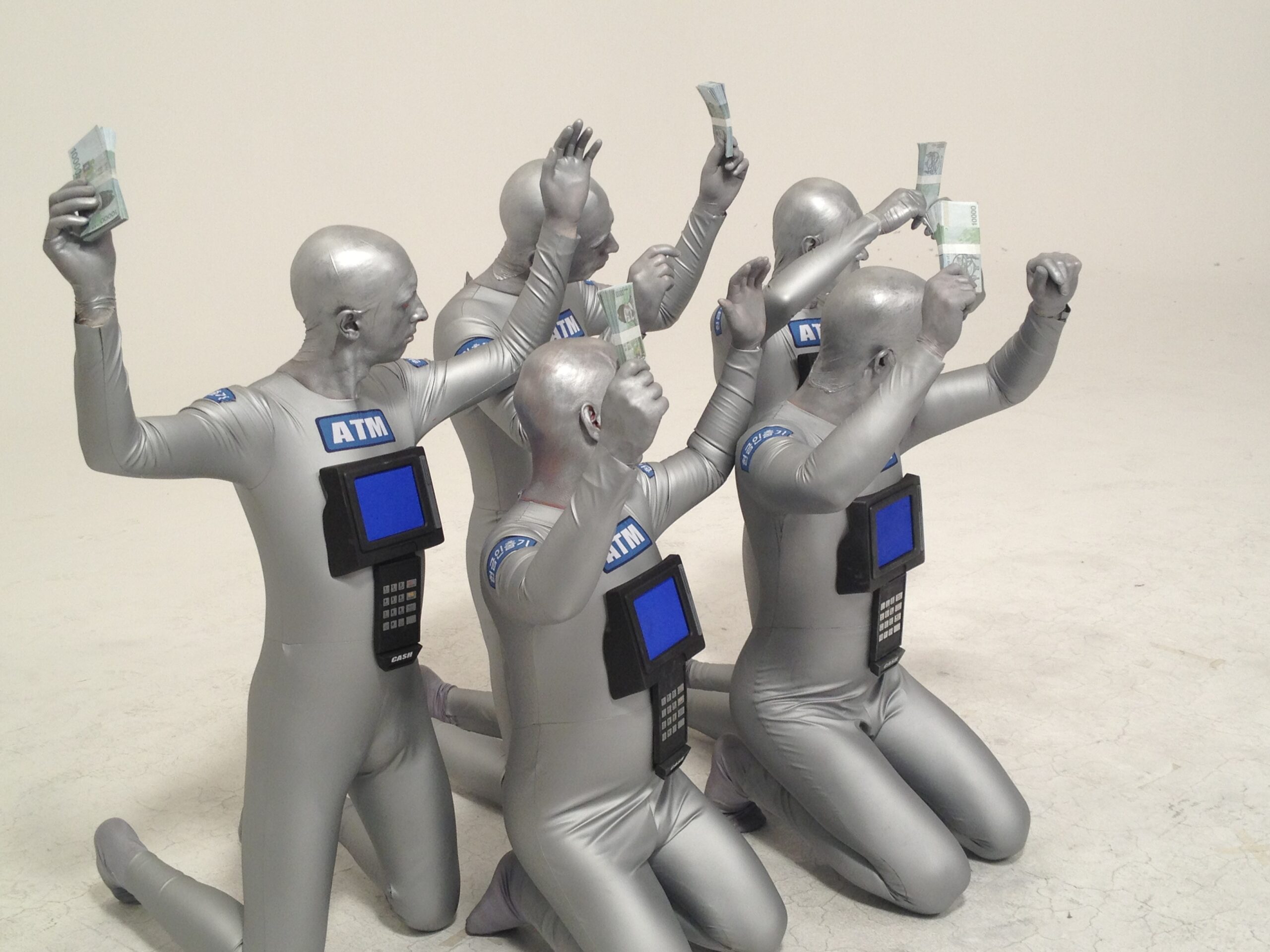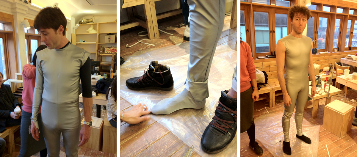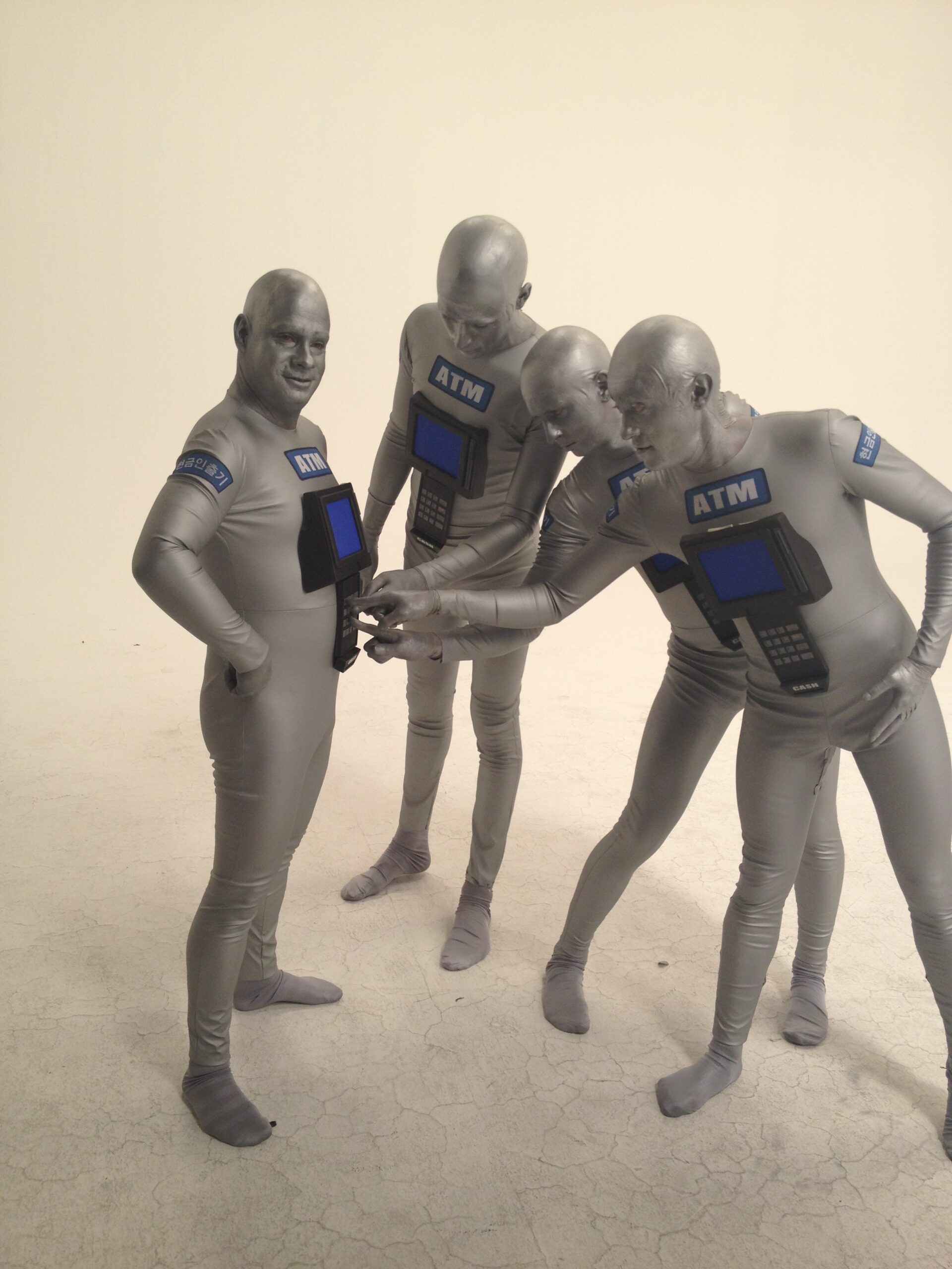 Costumes were tailored using a textile tape designed for costumes, ensuring a perfect fit from neck to toe for each model. Once makeup was applied to the models, the ATM Machines were attached, completing the ATM Men.