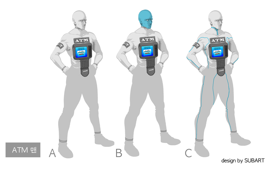 We sketched the storyboard to effectively express the commercial. At first, I designed the ATM machine in robot form with arms and legs attached to a box shape. Later, to obtain a comical effect, the design turned into a more human form.