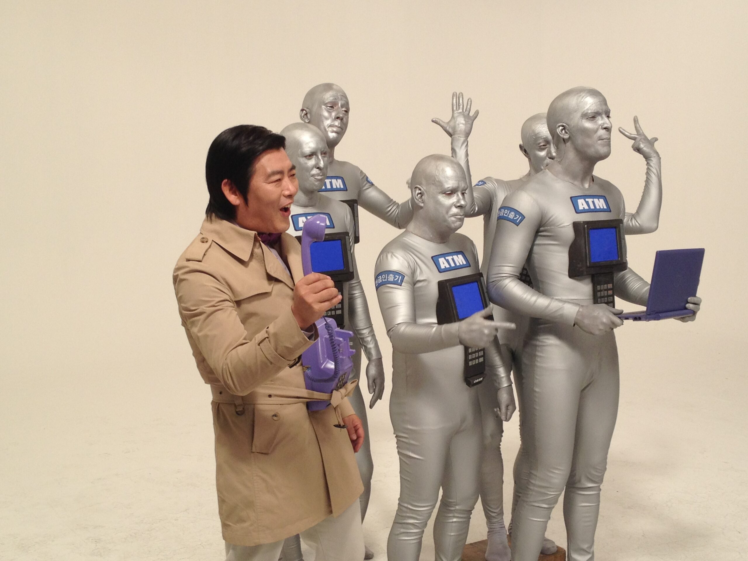 The TV commercial was able to be produced without the use of computer graphics, thanks to the perfect fit of the ATM machine costumes on the models.