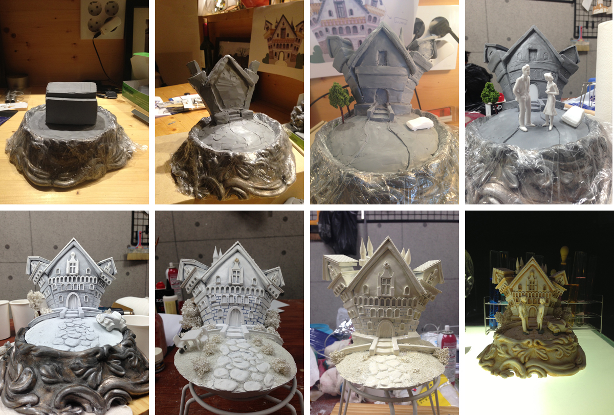 One of the crucial aspects in creating the snow globe was seamlessly transforming SHYNEE’s Minho and Girls’ Generation’s Yoonha into characters while maintaining a realistic appearance. The base of the snow globe was crafted from hard urethane. Initially, non-foaming rigid urethane was used to create the base, and adjustments were made to achieve the desired exaggerated three-dimensional effect. Small, angular areas such as windows and doors were covered with laser-cut acrylic, employing techniques from architectural model-making and diorama crafting.