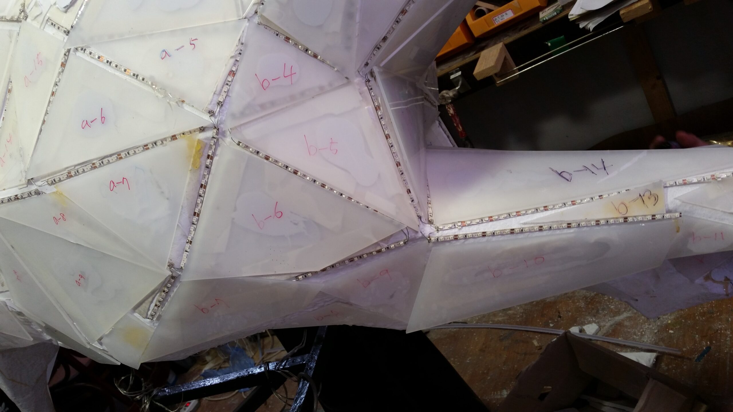 LED lights, heat sinking plane, semi-transparent acrylic (spreads light), urethane , compressed polystyrene